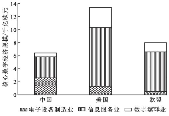 (2)从结构格局看,美国和欧盟比中国的数字经济更具优势,中国处于“大而不优”的状态,中国数字经济中电子设备制造业作为“硬件部分”占比太高,而信息服务业和数字媒体业作为“软件部分”仍有很大提升空间。