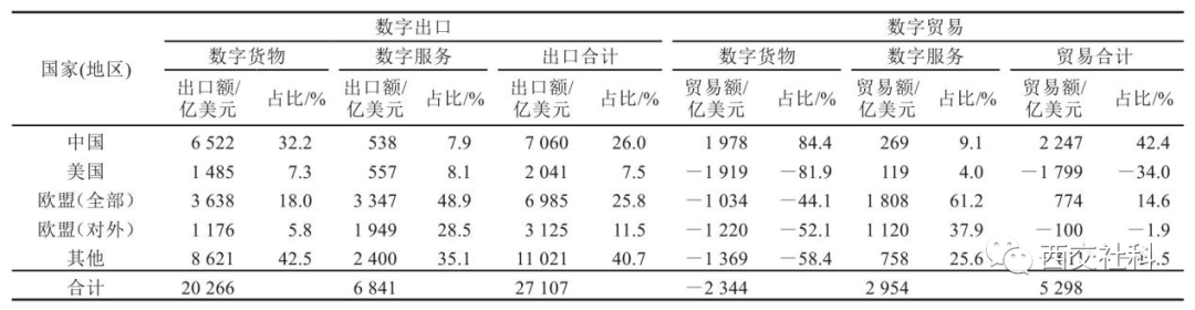 注:数据来源于世界贸易组织,欧盟数据中包含英国和其他27个国家,对欧盟数字服务贸易目标地与来源地的统计剥离了28国相互之间的贸易数据。