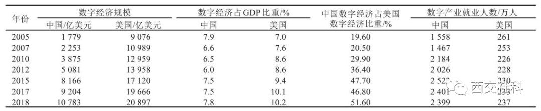 表1 2005—2018年中美狭义数字经济规模、比重及就业对比