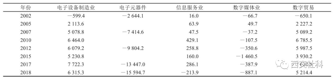 表5 2002—2018年中国数字贸易及其产业结构净出口 亿元