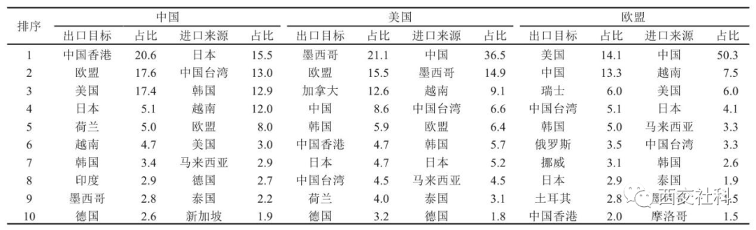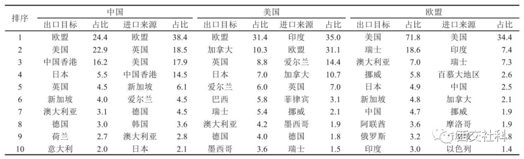 表3 2020年中美欧数字货物贸易出口目标地与进口来源地前十名 %