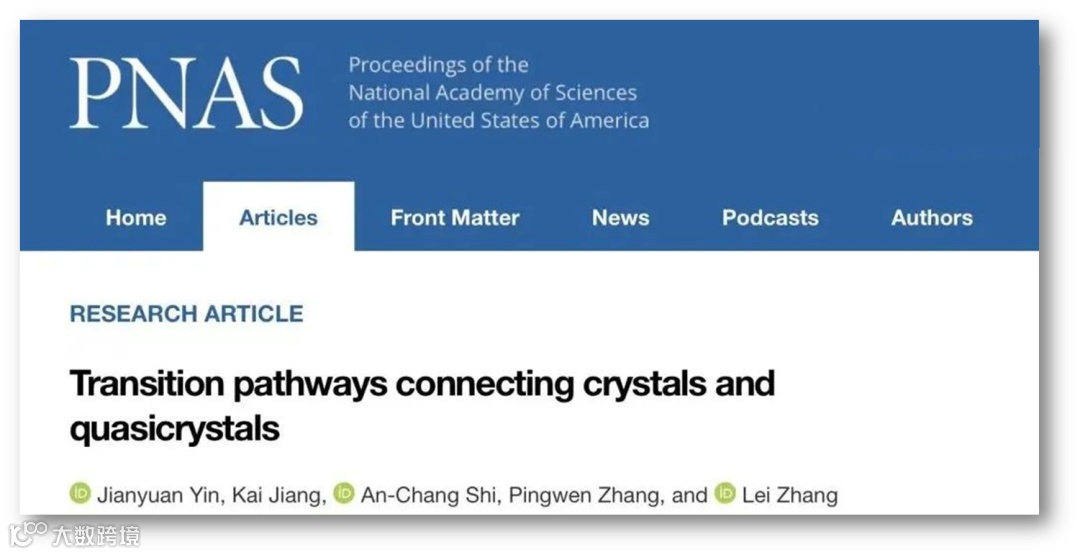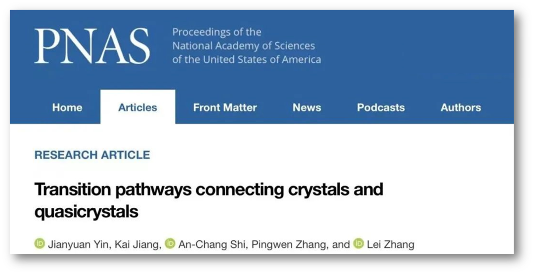 2021年12月,北京大学北京国际数学研究中心张磊副教授、数学科学学院张平文院士与合作者在美国科学院院报(Proceedings of the National Academy of the Sciences of the United States of America)在线发表题为Transition pathways connecting crystals and quasicrystals的研究论文。该工作通过数值计算得到了晶体和准晶之间相变的临界核和转移路径,揭示了准晶的成核过程。