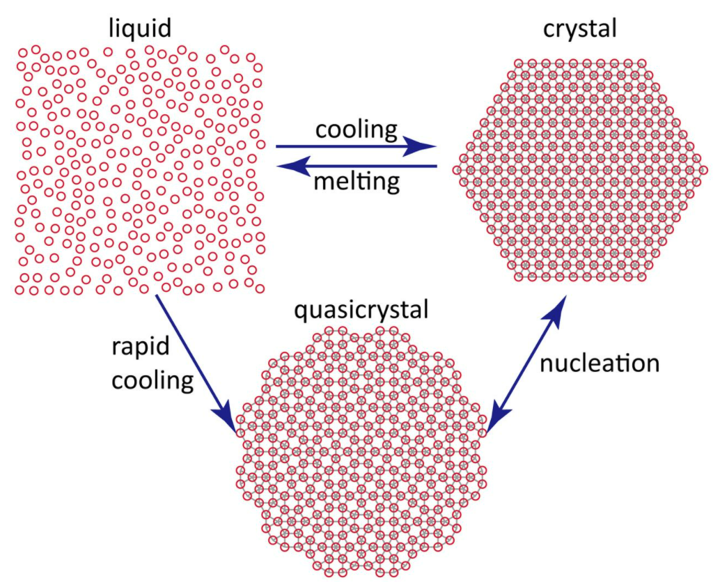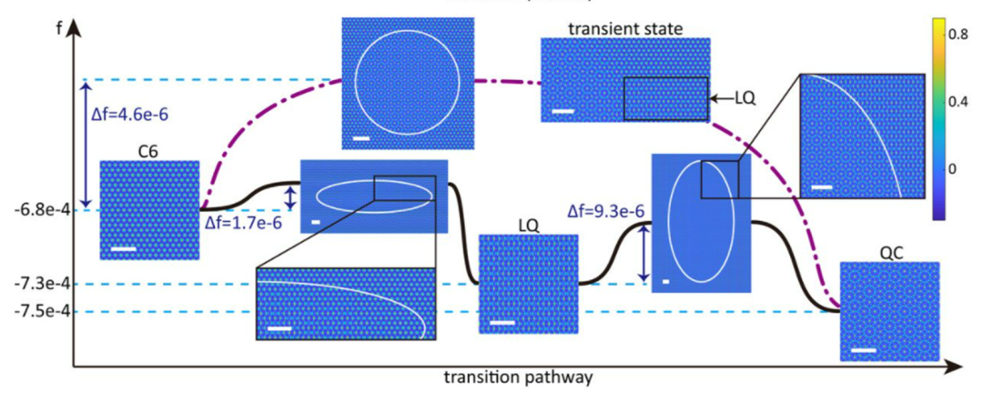 经过几十年的研究,人们得到了多种准晶,也理解了准晶的结构,但是准晶的成核问题,即从周期结构的晶体是否能涌现出准晶,仍然是凝聚态物理学中一个长久以来尚未解决的问题。相比于从无序结构(液体)到有序结构(晶体)的成核与相变,从晶体到准晶的成核过程要困难得多(图1)。这部分困难主要来自于准晶和晶体结构是非公度的,因此它们之间没有明显的外延关系。同时,成核过程是稀有事件,在实验中很难直接观测到,而且计算不稳定的准晶临界核要比计算稳定的准晶结构更加困难。