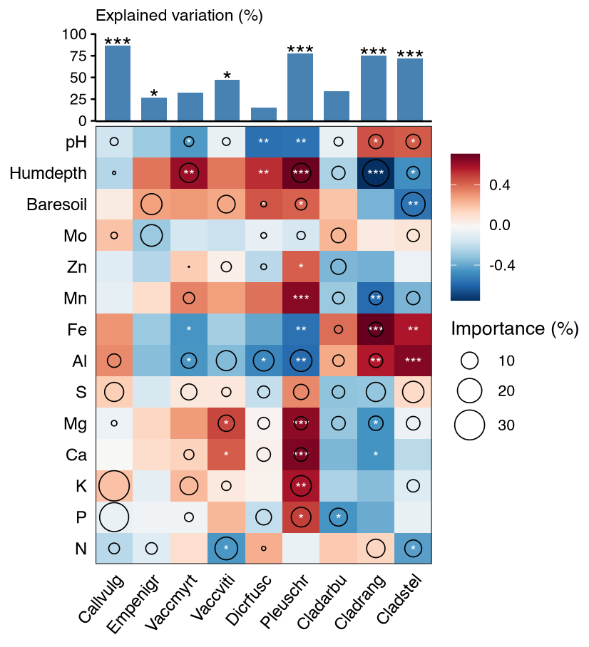 该图清晰地展示了环境因子对多个物种丰度变异的解释率与统计显著性:上方的柱状图表示每个物种的整体解释率(Explained variation, %),星号标注了回归模型的显著性水平;下方的热图结合颜色、圆圈大小与显著性符号,分别表示不同环境因子对各物种的效应方向、贡献率大小和显著性水平。颜色越深代表效应越强,圆圈越大代表解释贡献越高,星号数量表示显著性程度。这类图能够直观地揭示环境梯度与群落结构之间的定量关系,是回归方差分解结果可视化的经典形式之一。