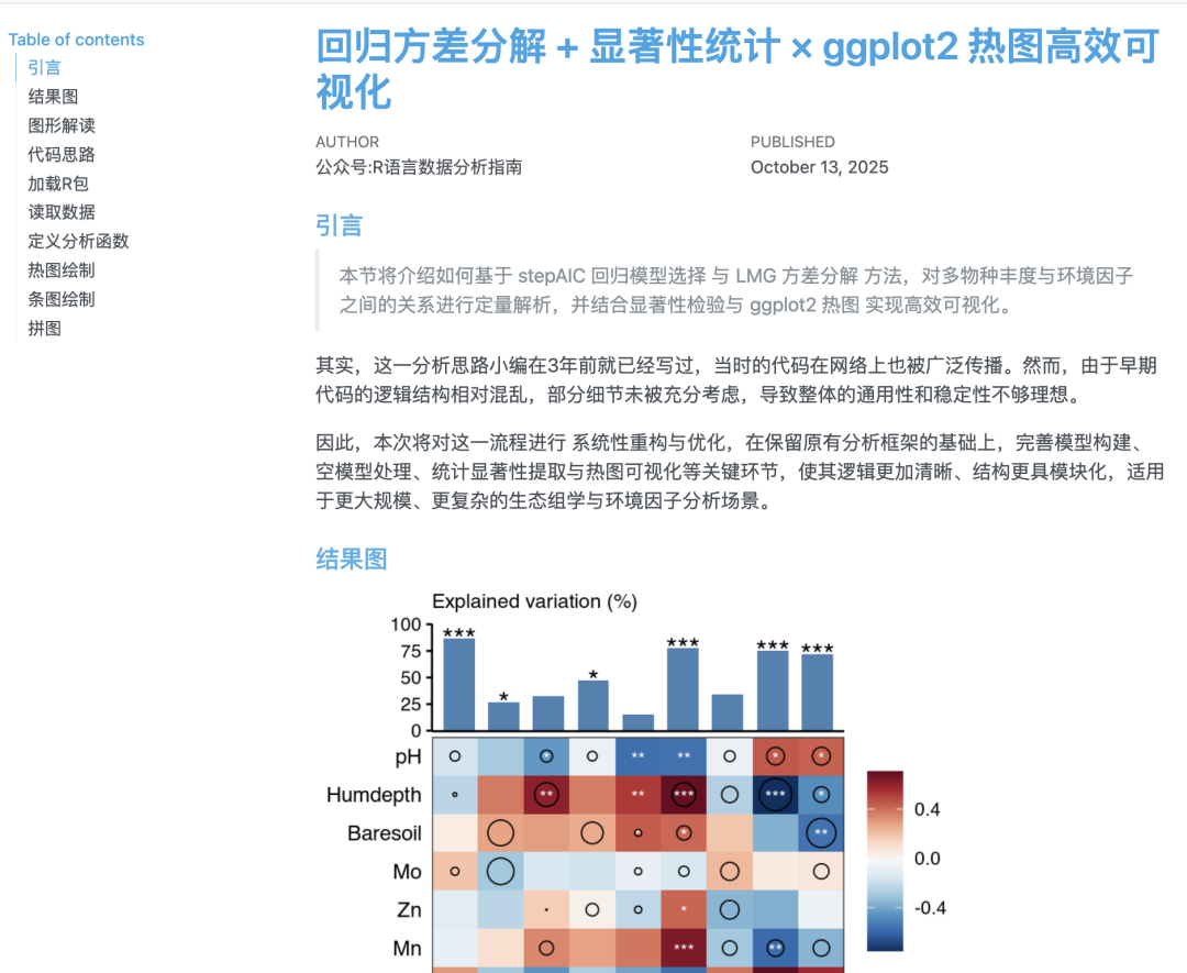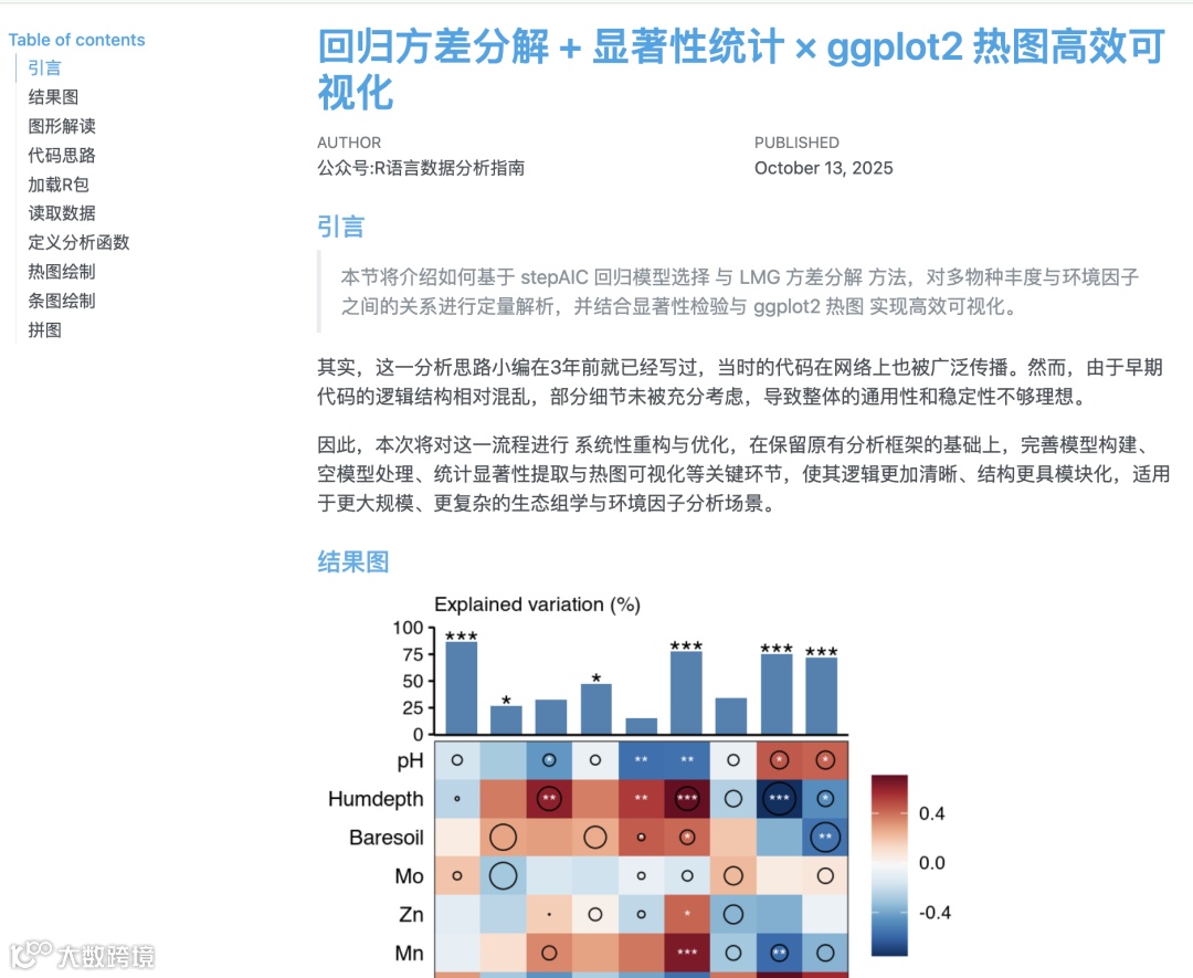 本次的分析代码旨在通过 stepAIC 回归模型选择 与 LMG 方差分解,系统评估多物种丰度与环境因子之间的关系。其核心流程包括: (1)利用 stepAIC 对多元线性回归模型进行变量筛选,降低多重共线性对解释力的影响; (2)通过 LMG 方差分解量化各环境因子对总解释率的贡献; (3)对回归模型整体显著性进行 F 检验,并以符号形式标注; (4)结合 ggplot2 构建热图,实现多物种 × 多环境因子的贡献率与显著性信息的可视化。 相比早期版本,该代码在模型稳定性、异常情况处理和结果通用性上均有所提升,更适合大规模群落生态与环境因子联动分析。