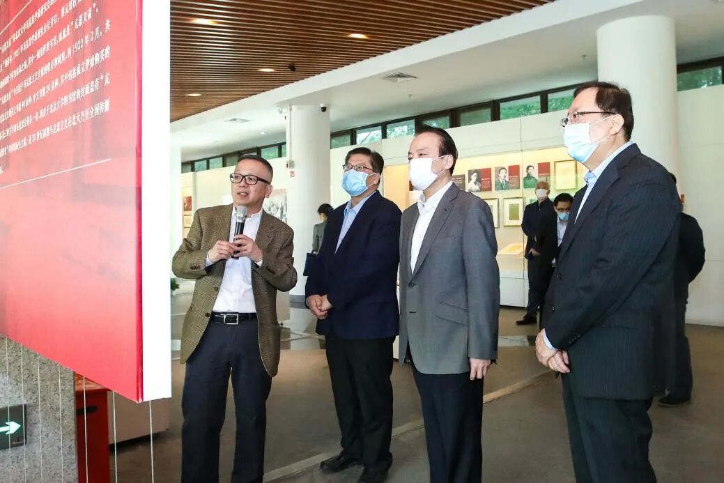 4月20日,新华社社长、党组书记何平一行到访北京大学,北京大学与新华社签署战略合作协议。图为北京大学党委书记邱水平、校长郝平陪同何平参观北京大学校史馆。