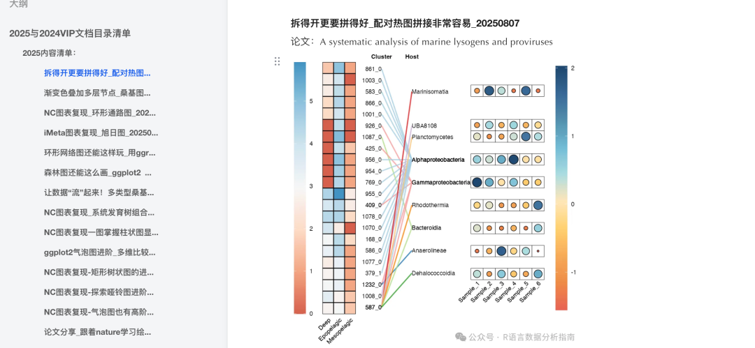 所选案例图绝大部份属于个性化分析图表,数据案例多来自已经发表的高分论文,并会汇总整理分享一些论文中公开的分析代码。 2025年起提供更加专业的html文档如下所示,更加的直观易学。文档累计上千人次购买拥有良好的社群交流体验,R代码结构清晰易懂.