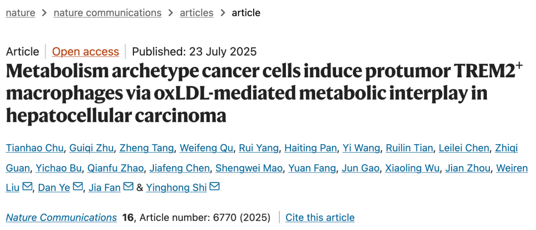 Chu, T., Zhu, G., Tang, Z. et al. Metabolism archetype cancer cells induce protumor TREM2+ macrophages via oxLDL-mediated metabolic interplay in hepatocellular carcinoma. Nat Commun 16, 6770 (2025). https://doi.org/10.1038/s41467-025-62132-y