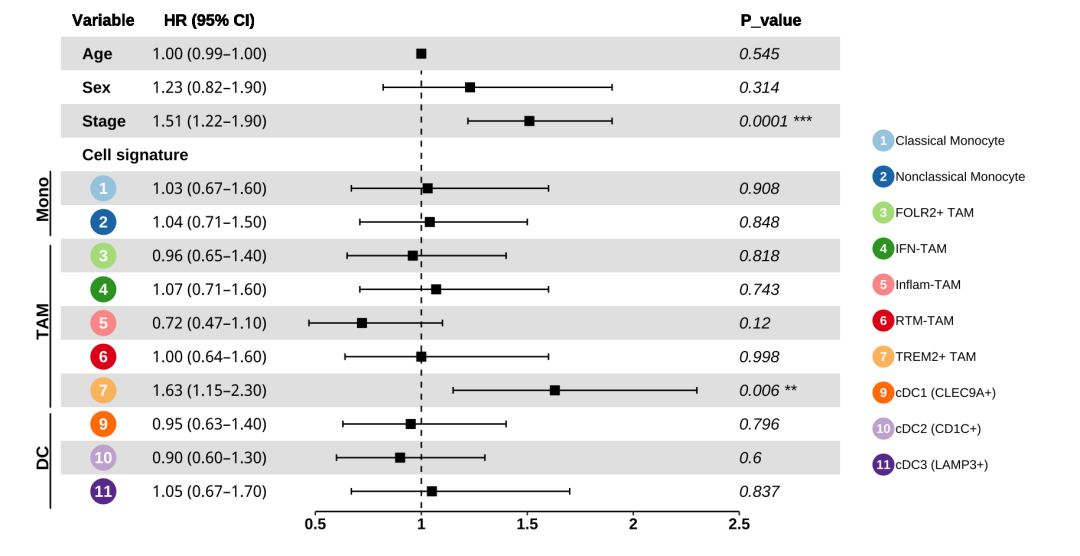 需要指出的是,此类高度定制化的图例设计和元素排布,常规的森林图专用包(如 forestplot等)往往难以实现,因其结构较为封装,不利于图层级微调。而使用 ggplot2 进行完全自主绘制,配合 grid、ComplexHeatmap::Legend() 等组件,则可以灵活控制图中每一个元素的位置、颜色与含义,实现更高水平的定制化表达。