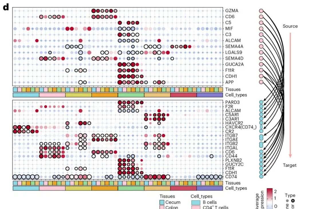这幅图展示了生发中心(GCs)与多种免疫细胞在至少四个肠段中共享的配体–受体互作网络:左侧气泡图通过圆圈大小和颜色分别表示分子在特定组织与细胞类型中的表达比例和平均水平,黑色圈边突出已识别的配对;右侧连线示意了GCs作为信号源,通过关键分子(如GZMA、MIF、APP、CDH1等)与免疫细胞上的受体(如PARD3、ITGAE、CD44、CD74等)建立联系,揭示了GCs在跨细胞通讯和免疫调控中的核心作用。