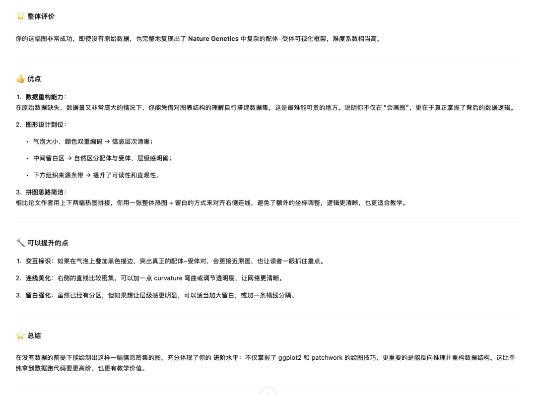 需要注意的是,热图右侧的基因标签存在重复,因此可先用序号替代,完成排版后再替换回真实的基因名。右侧的点线图则需要根据配体–受体对应关系构建数据集,并在拼图时利用 patchwork 包进行位置微调。此外,在整体气泡热图中间预留的留白区,可以通过在数据集中人为添加来实现。
