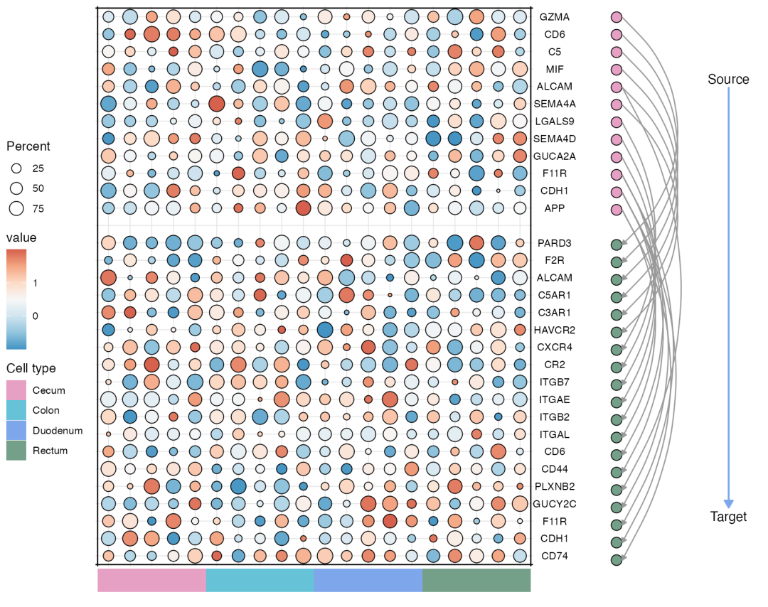 换句话说,右侧连线就是在告诉读者:哪些分子对在不同细胞间起桥梁作用,从而建立跨细胞的通讯网络