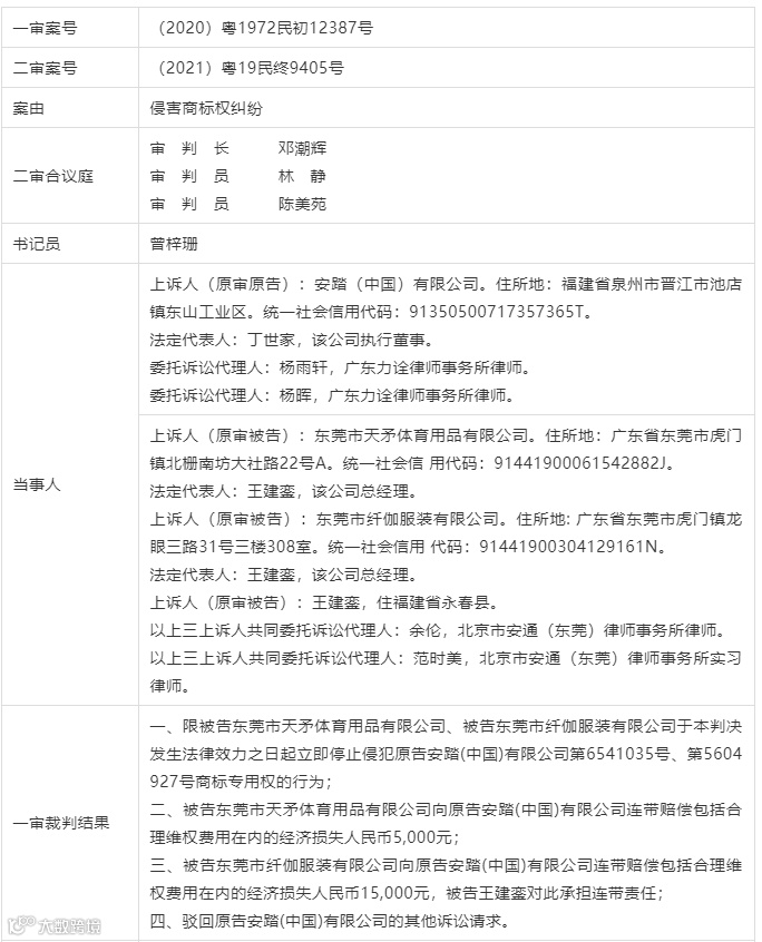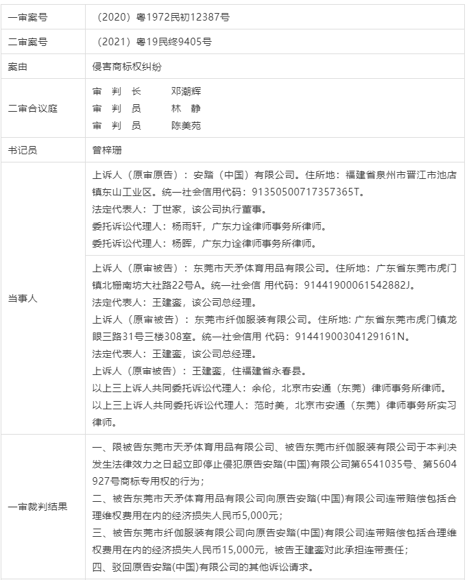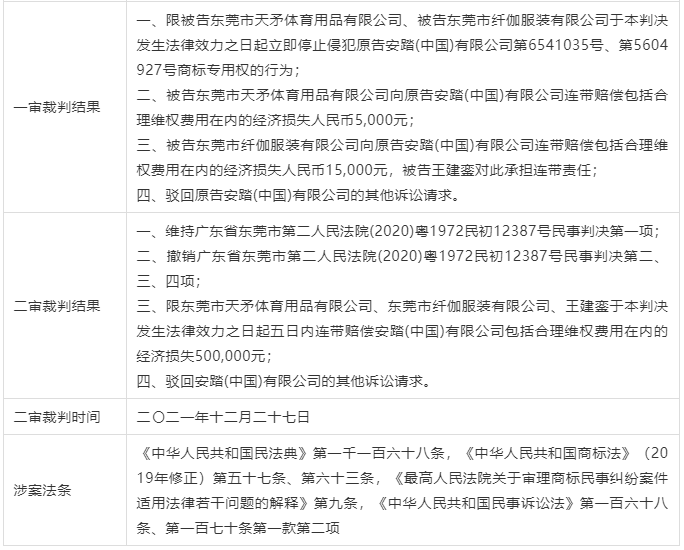 ——安踏(中国)有限公司与东莞市天矛体育用品有限公司、东莞市纤伽服装有限公司、王建銮侵害商标权纠纷案