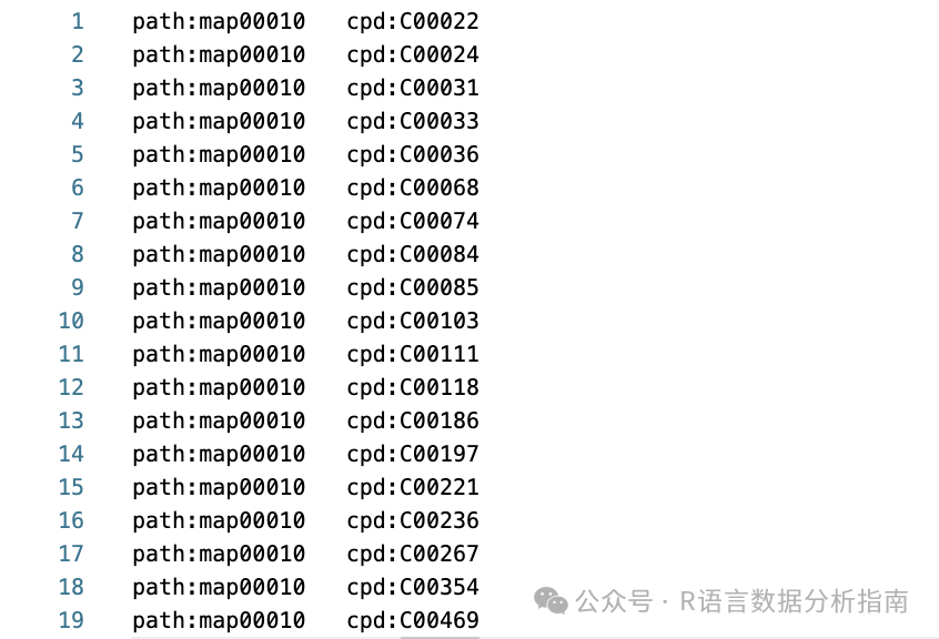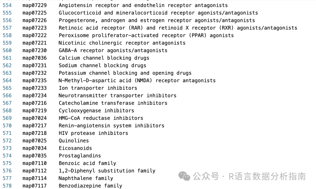 富集分析总共需要三个文件,kegg 数据库注释文件,代谢通路背景文件,差异代谢物编号。代谢物注释文件做代谢组业务后公司会提供,因此前期需要准备的只有注释文件。此文件可通过代码从kegg网站上下载即可,目前有578个pathway。