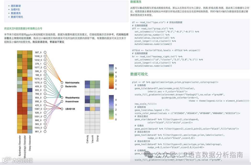 所选案例图均属于个性化分析图表完全适用于论文发表,内容异常丰富两年累计发布案例图200+,2024年6月起提供html版注释文档更加直观易学。文档累计上千人次购买拥有良好的社群交流体验。R代码结构清晰易懂,为防止中文乱码2024起提供单独的注释文档