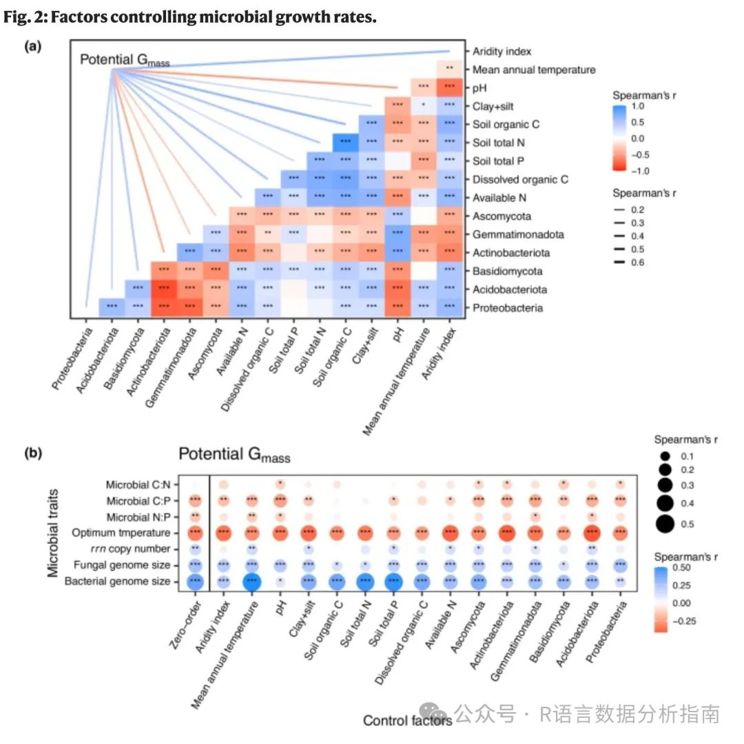 ❝图2中最主要的当然是a图,此图相信读者们在很多论文中都看到过。热图色块表示组内相关性分析的结果,链接线则表示其它指标与理化因子等之间的关系,即组间相关性分析结果。通常此图的绘制主要是通过linkET包来实现,但是若是对图形有更高的个性化要求修改起来较为麻烦,在该论文图中作者则是通过自定义函数来进行相关性分析及数据格式整合,最终通过geom_segment()函数来添加左侧的链接线,这种思路非常值得推荐。下面来展示具体的代码,数据+代码论文中均可下载。