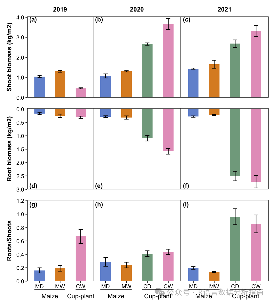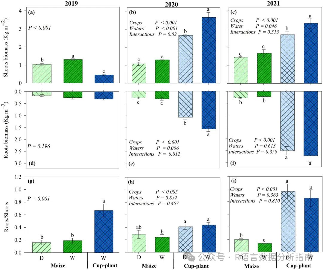 除此之外还有不少细节需要调整,因此此图可以作为一个进行学习非常好的案例。由于绘图代码非常多,且统计分析有按年份分为单因素与多因素,因此此次先只介绍绘图细节,方差分析的结果后期在介绍。