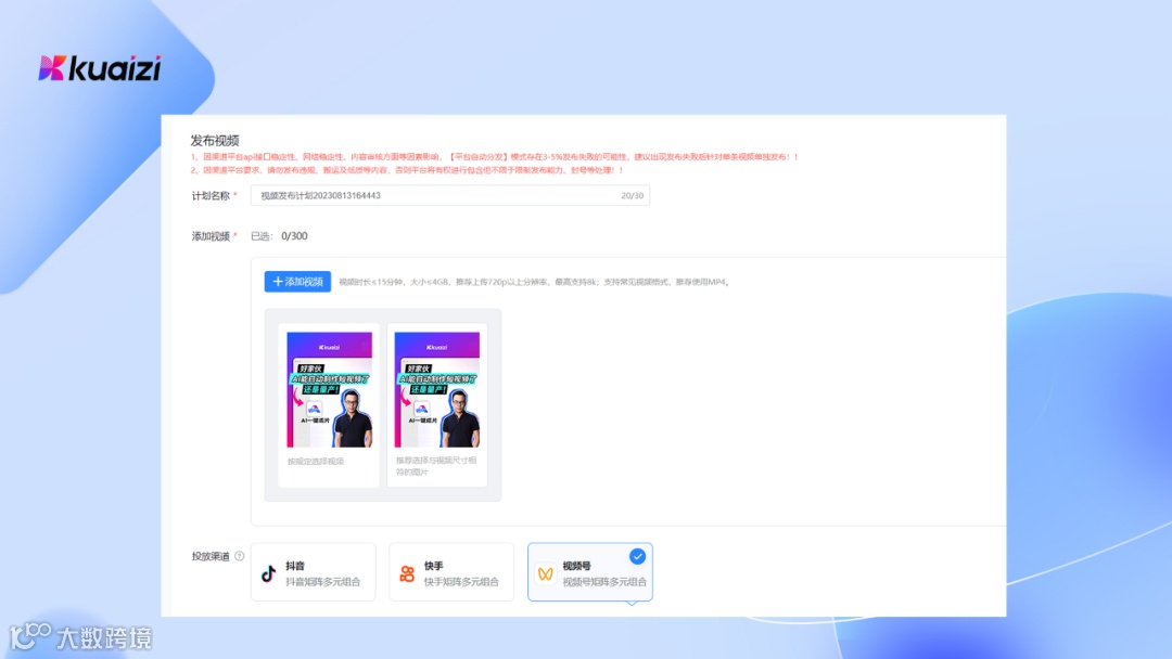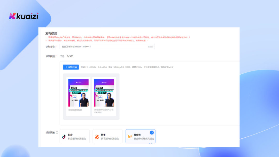 近日,Kuaizi矩阵宝可以发布视频号视频,和抖音、快手一样,现在可以直接在矩阵宝上统一管理和分发视频号矩阵视频,一站式解决跨平台,多账号私域矩阵运营的难题。
