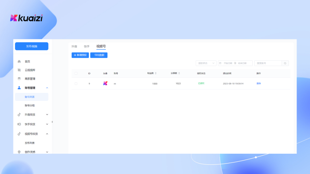 千呼万唤始出来,矩阵宝视频号正式上线使用,与抖音、快手平台的使用逻辑一致,先授权账号再发布视频,结合Kuaizi的剪辑版块,轻松打造视频号矩阵。