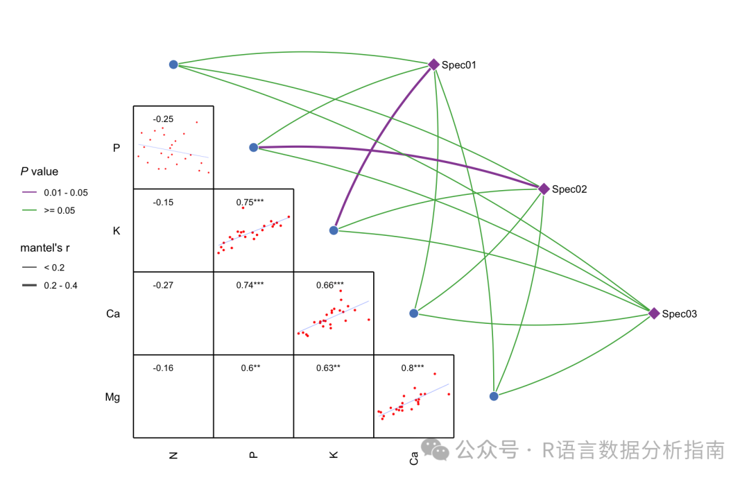 ❝本节来对常规的相关性热图做一点改变增加一点新的元素,以往此类图内框中主要展示数据之间的R值与P值,此次通过代码在图中来添加不同组间样本的分布情况,通过图片的形式将其添加到热图框内,若数据量较小可以如此操作,同时也可根据样本分组情况进行颜色填充,若数据量较大则不太适宜。散点图的绘制可以使用循环的方式进行,可使用添加图片的形式也可以使用ggdraw函数来实现,代码方式多种多样,小编在这里只展示一类。