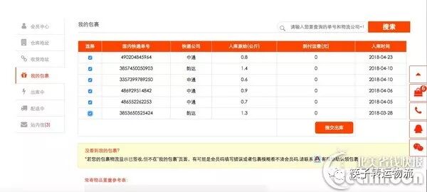 完成注册以后,打开会员中心,有几个信息很重要:一是仓库地址,这是我购物时候要填写的收货地址;二是会员代码,仓库每天会收到不同客户的包裹,他们就是通过这个代码把东西归档到对应的客户项下的。其他的,“收货地址”,是我在美国的住址;“我的包裹”,是购物网站寄过去的包裹,仓库收到后会以快递单号和公司名称的方式更新在系统里方便查询;“出库中”,是经过客服处理打包的包裹,里面会显示你要支付的国际运费,是客户缴费的环节;“配送中”就是国际包裹寄出后大家最期待的部分了,每天起床第一件事就是track一下包裹到哪儿了。