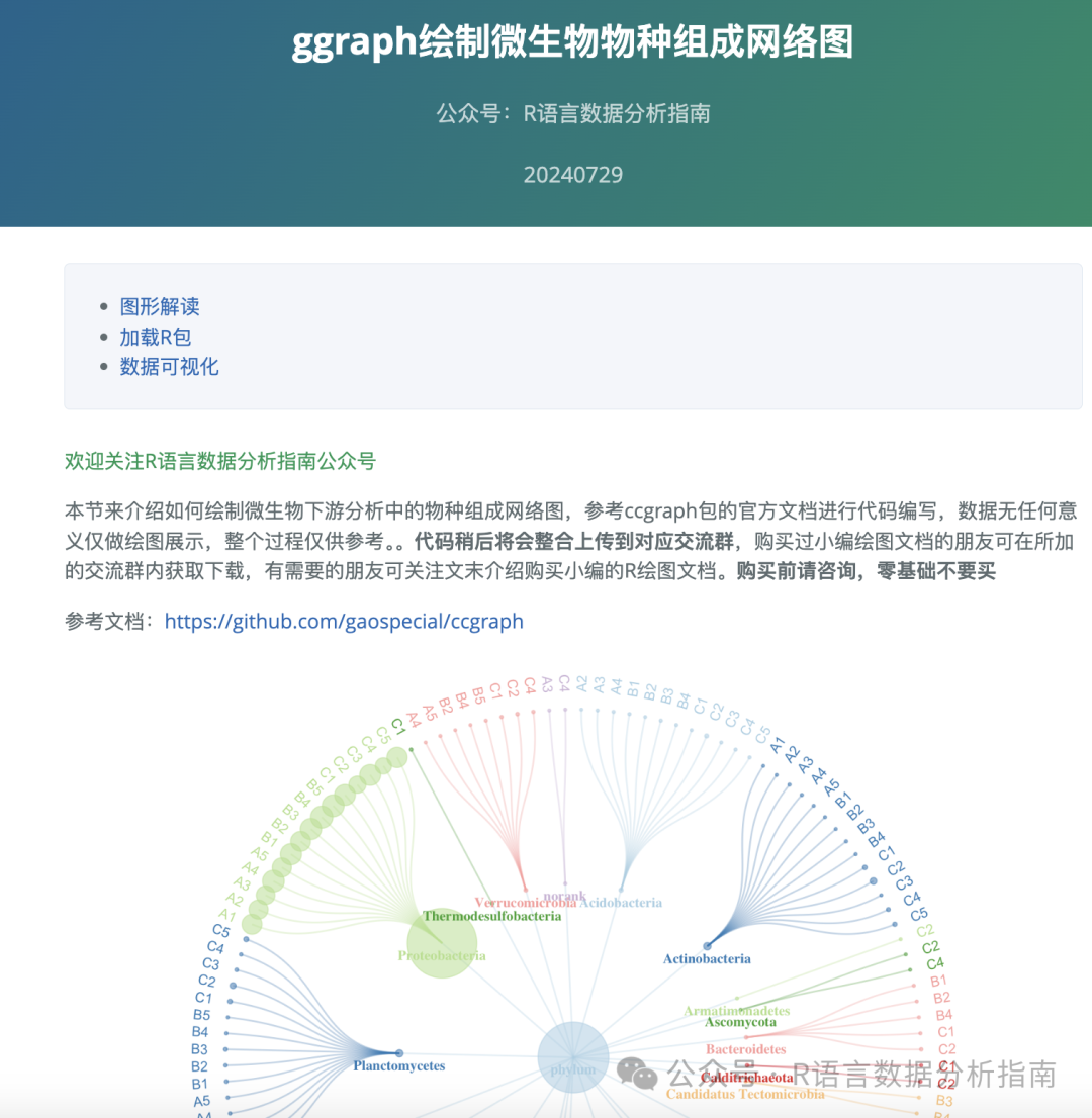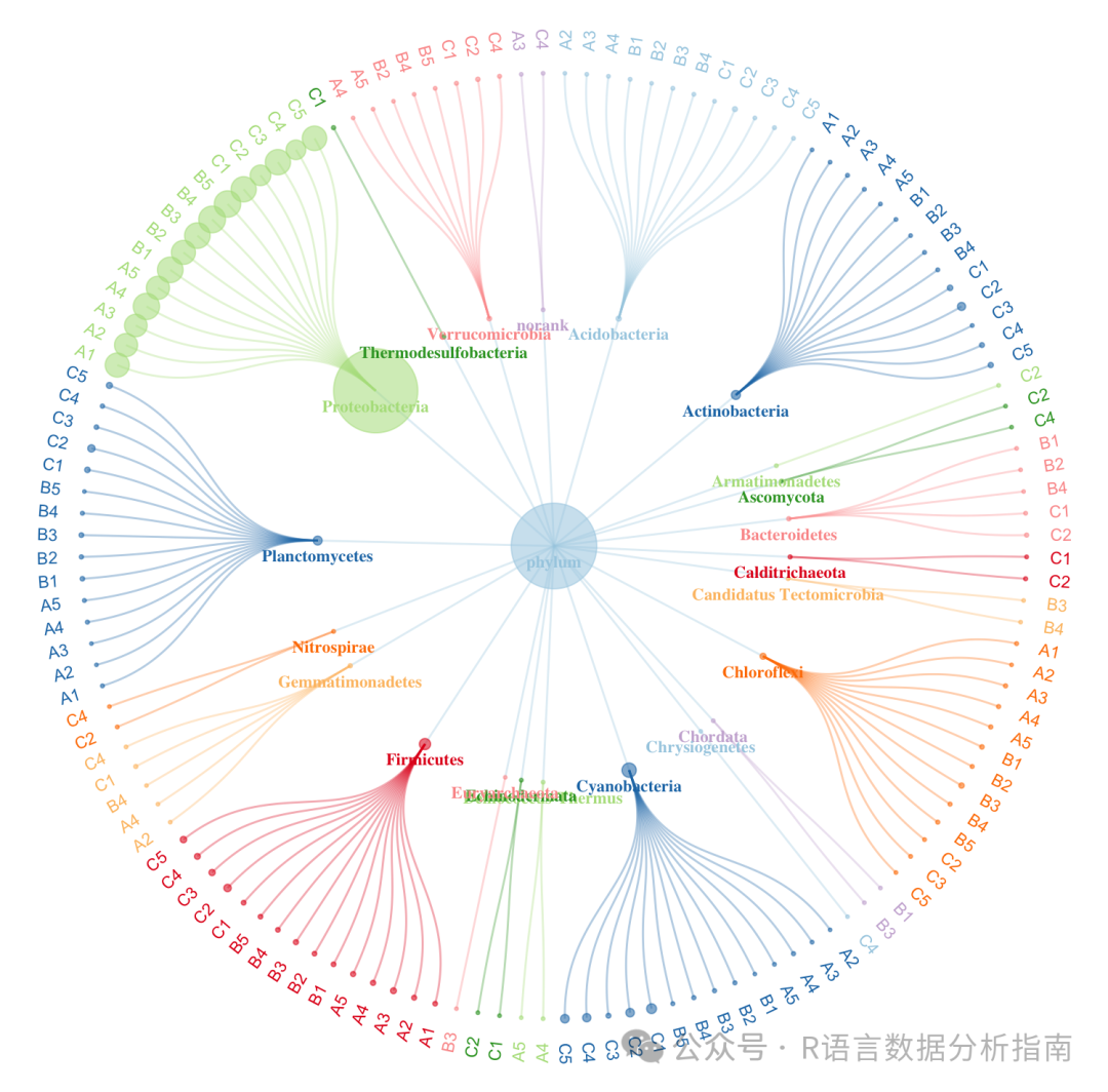 ❝本节来介绍如何绘制微生物下游分析中的物种组成网络图,参考ccgraph包的官方文档进行代码编写,数据无任何意义仅做绘图展示,整个过程仅供参考。代码稍后将会整合上传到对应交流群,购买过小编绘图文档的朋友可在所加的交流群内获取下载,有需要的朋友可关注文末介绍购买小编的R绘图文档。购买前请咨询,零基础不要买