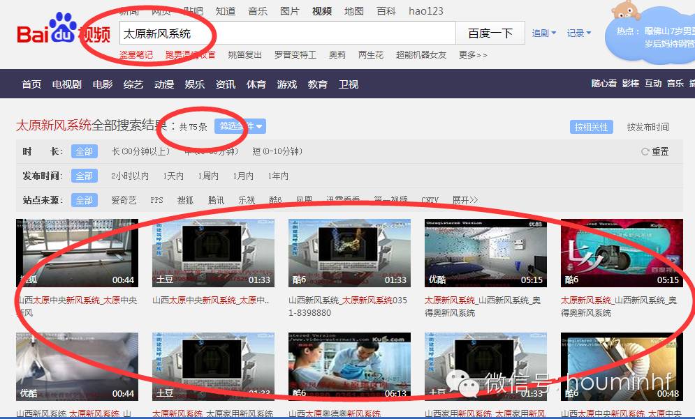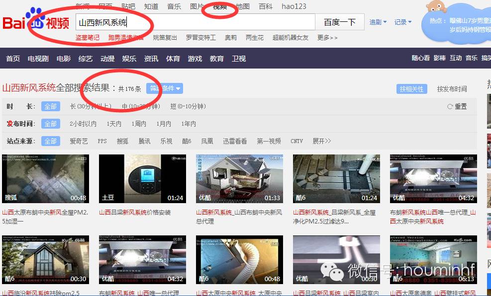 图中我们搜索“新风系统”的视频,百度只有2129条,也就是全国范围内才只有2129条视频,我们的客户和我们的代理商在做产品的时候都会看视频的,如果厂家能够在视频上多做些推广,如果能够在网络上存在关于我们牌子的新风系统的各种视频多大3000多个的话,一定能够垄断百度视频,相信一定能够给您们带来很多客户群,目前这个是一个空白,谁如果做了谁就先赢得先机(因为我是做山西市场,不做全国,所以垄断山西就行了)