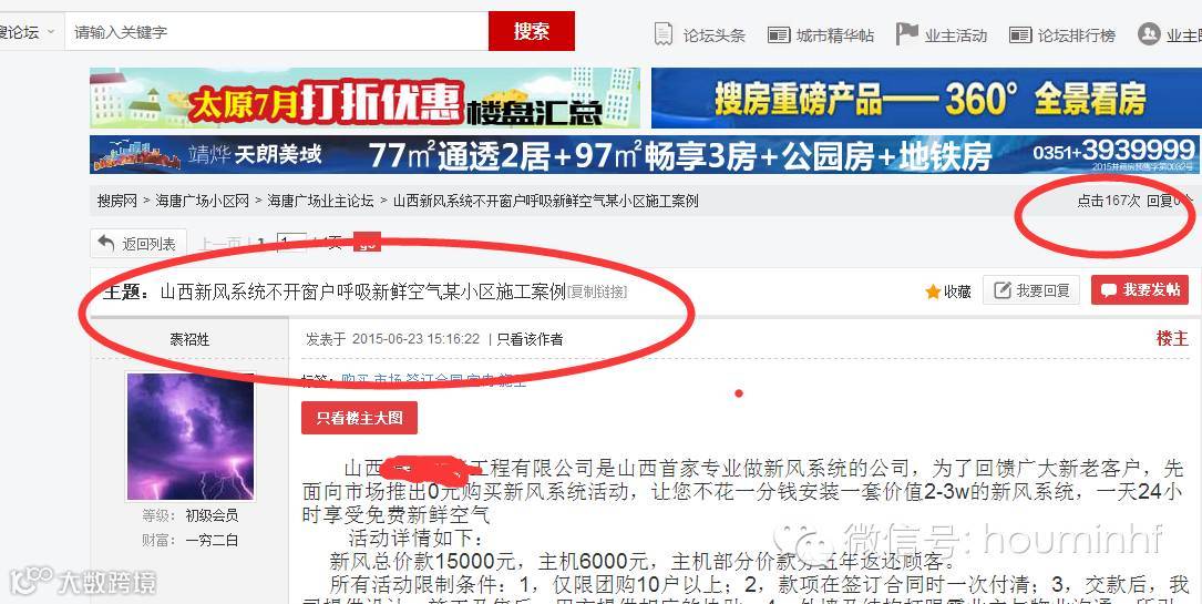 从上图中我们可以清楚的看到这篇 “山西新风系统不开窗户呼吸新鲜空气某小区施工案例” 文章是发布在搜房网的业主论坛的,并且这个帖子是在2015年6月23日发表的,到今天不到一个月的时间已经被浏览了167次了,而且只是这一个帖子,每天我们都发布100个这样的帖子,每个帖子每天的流量大概有30-50左右,大家想想看看有多少人能够看到,更重要的是,搜房网的业主论坛都是些什么人才会去浏览啊,很多都是业主才会去的,事实证明我们的很多单子都是从搜房网的业主论坛里看到过来的