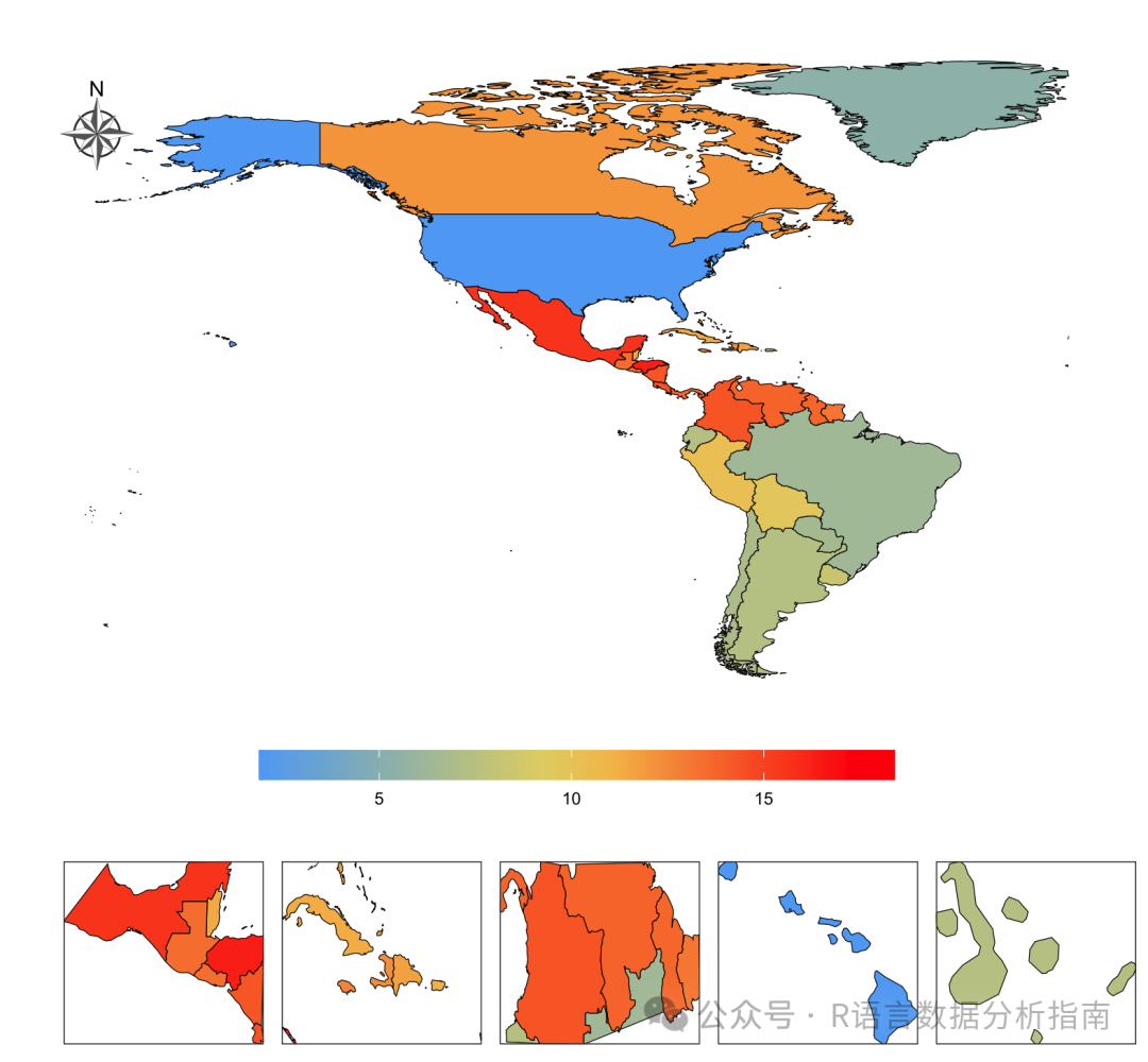 ❝最近交流群内看到有不少朋友讨论GBD类论文相关地图的问题,本节就来通过此篇文档详细介绍一下如何绘制组合地图。数据集为R内置的map_data("world")通过数据筛选出美洲信息进行地图绘制,GBD数据为整理好的ASIR数据集,数据无任何意义仅做绘图展示,整个过程仅供参考。数据代码稍后将会整合上传到会员交流群,购买过小编绘图文档的朋友可在所加的交流群内获取下载,有需要的朋友可关注文末介绍购买小编的R绘图文档。