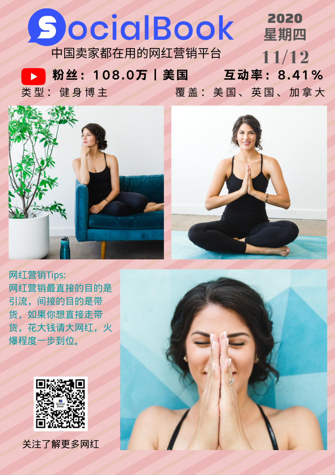 这位美丽的博主是位专业的瑜伽教练,她每周都会分享视频带大家在家做瑜伽。她的内容针对不同基础的人群,按身体部位、运动时段、难易程度,制作的视频有长有短。满足了各种喜欢或者想尝试瑜伽运动的人群的需求。