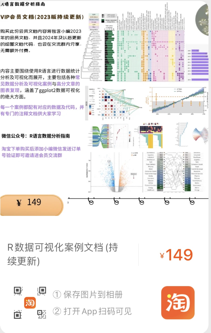❝此份R可视化学习文档目前包含(2023年份+2024年份)「已经更新上传的150+案例文档」后期内容将在交流群内持续更新,每个案例都附有相应的数据和代码,并配有对应的注释文档,方便大家学习和参考。有需要的朋友欢迎到「淘宝店铺」 「R语言数据分析指南」下单购买。购买后会邀请加入交流群