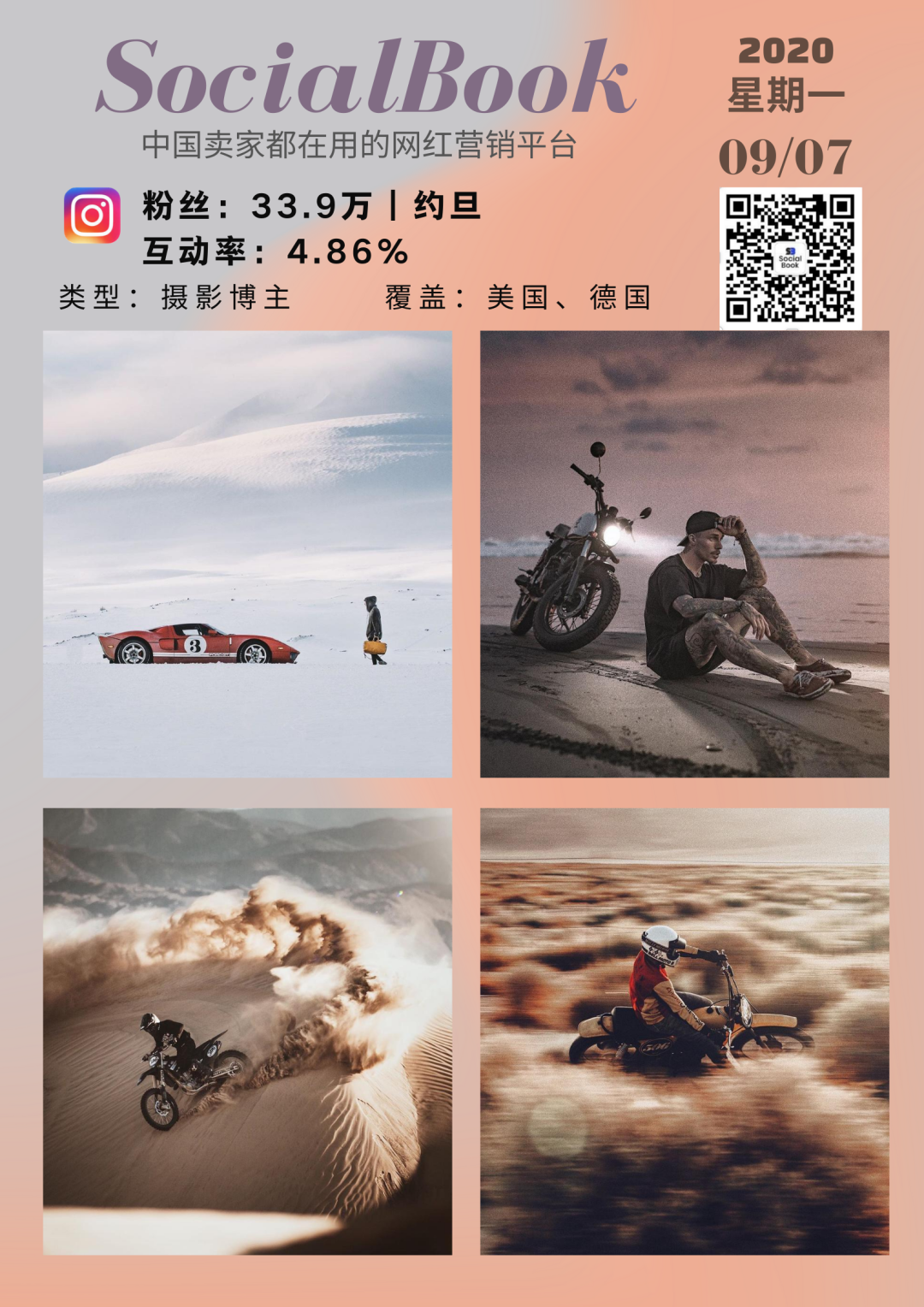 今天推荐给大家的博主是位非常酷的摄影师,他的拍摄内容以机车、越野车及飞机为主。那些在雪地、漫天黄沙、森林道路、盘山公路、积水路面奔驰的车辆的动感和激起周围环境的变幻画面,给人极大的视觉冲击和魔幻效果。激发赛车爱好者对冒险刺激运动的向往和追求。好的摄影者总能引发观者对画面表达的共鸣,这就是艺术!