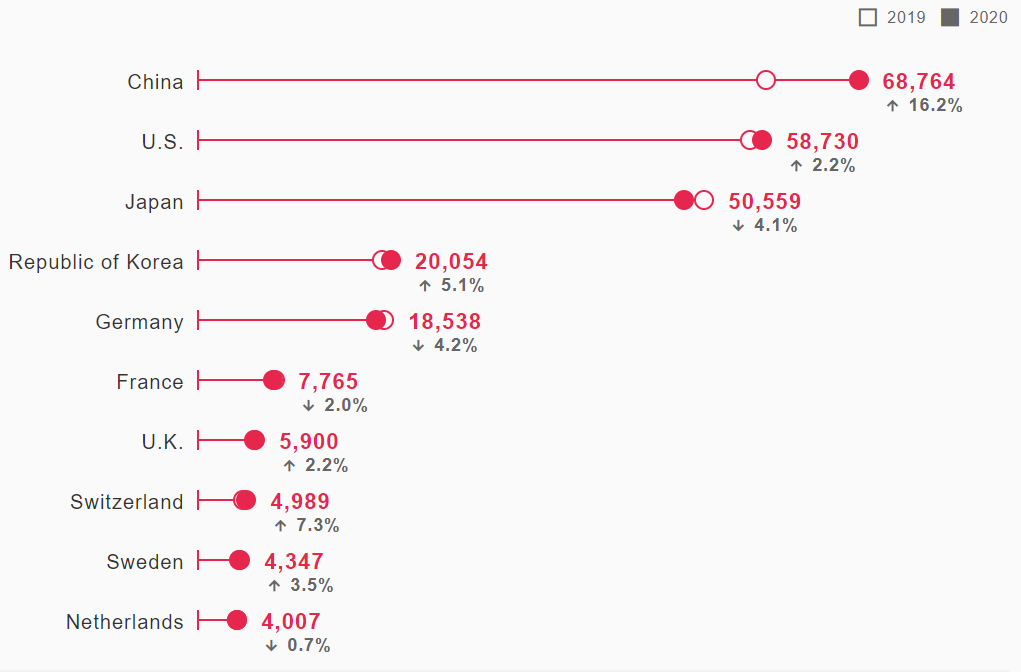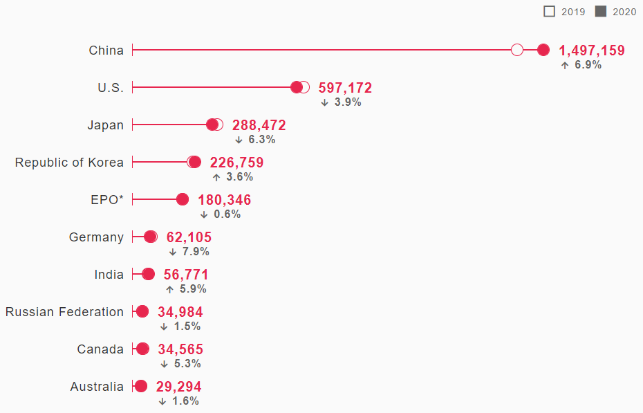 2020年,中国知识产权局受理专利申请150万件。紧随其后的是美国、日本、韩国和欧洲专利局的主管局。2020年,前10名办事处占全球总数的92%。