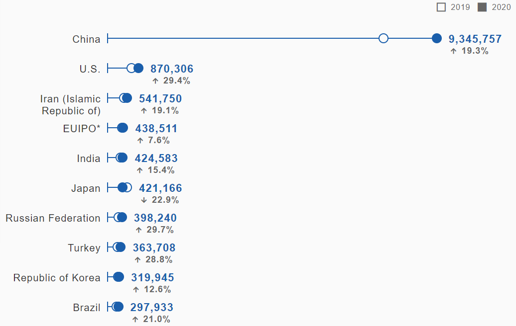 2020年,中国知识产权局共受理指定类(类数)约930万个,比2019年增长19.3%,紧随其后的是美国、伊朗伊斯兰共和国、欧盟知识产权局和印度。2020年,前10名办事处占全球总数的78%。