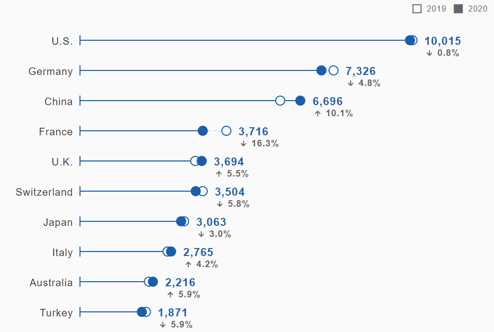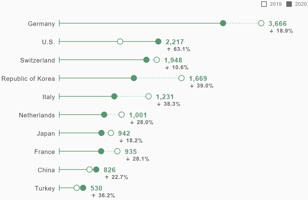 受疫情影响,2020年海牙申请的外观设计约 18,610件,比 2019 年下降14.9%。海牙体系的最大用户是德国的申请人,其次是美国和瑞士的申请人。2020年,排名前10位的国家占海牙申请总数的80.4%。