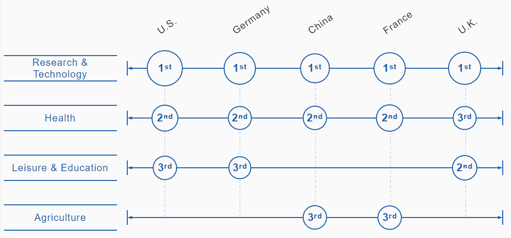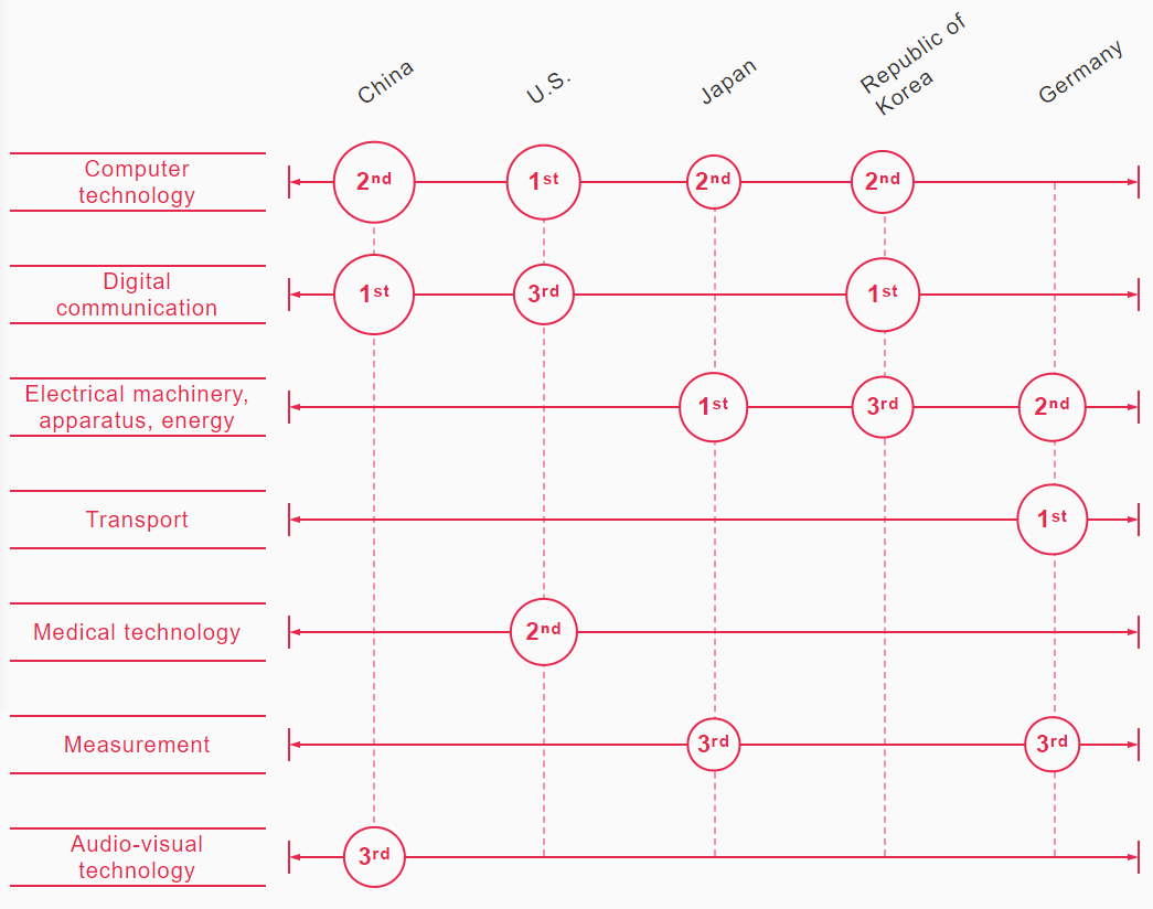 中国和韩国的申请人在数字通信领域的专利申请较为密集,而美国的申请人在计算机技术领域申请的专利最多。对日本来说,顶尖的技术领域是电机,而对德国来说则是交通运输。