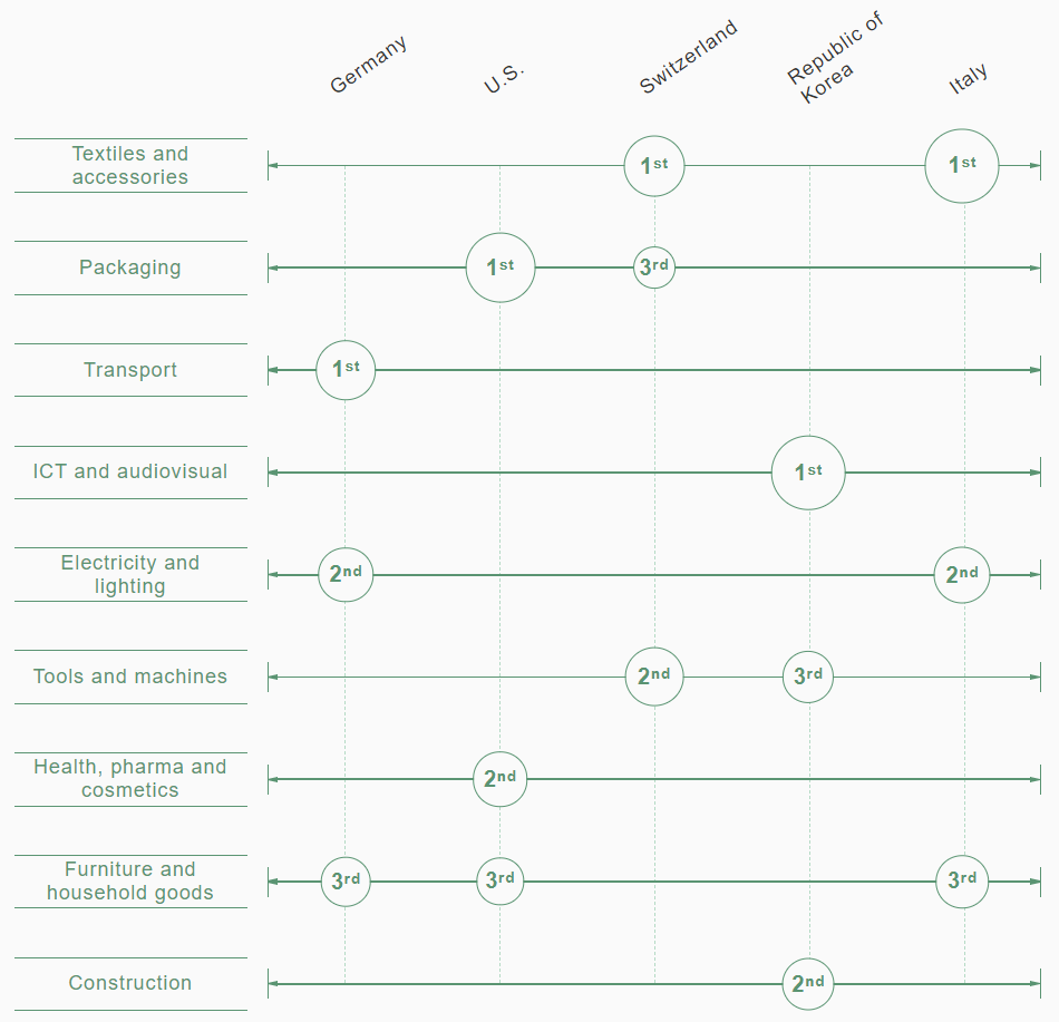 来自德国的申请人在运输方面提交的申请最多,而来自韩国的申请人在与 ICT 和视听相关的设计方面提交的申请最为密集。瑞士和意大利的纺织品和配饰部门占最大份额。美国申请人在包装领域提交的申请最多。
