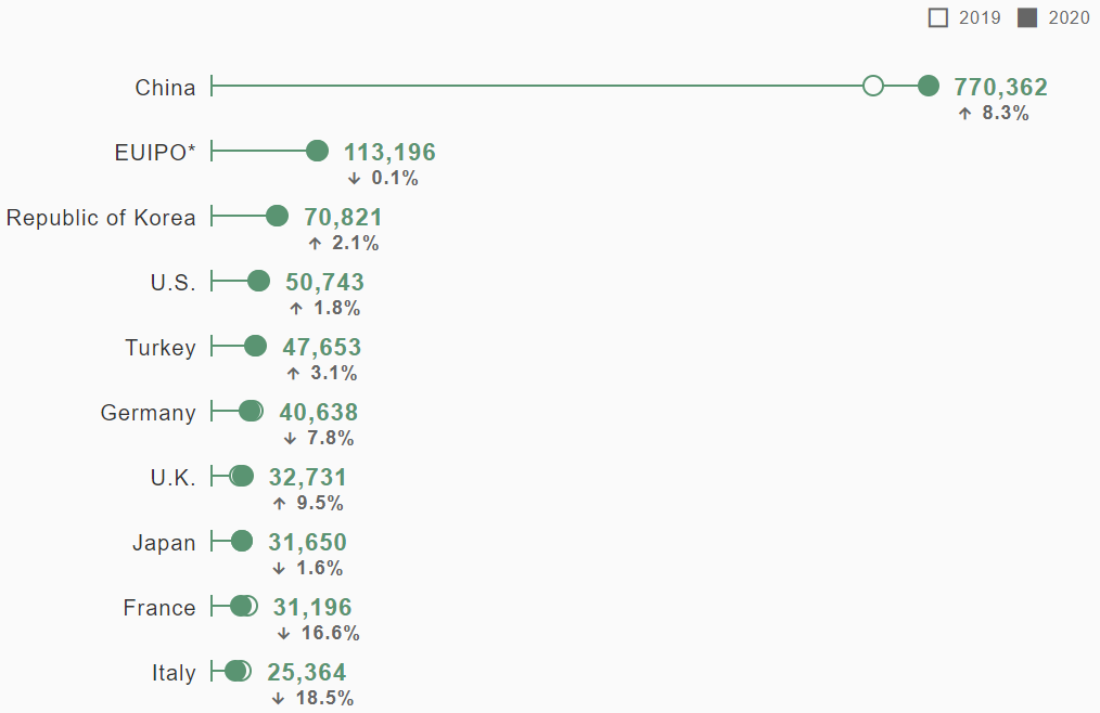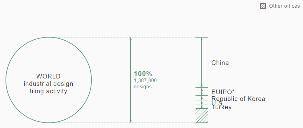 2020年提交的申请中包含大约140万件外观设计。其中近76%被中国、欧盟知识产权局、韩国、美国和土耳其的知识产权局收到,仅中国就收到了世界总数的55.5%。
