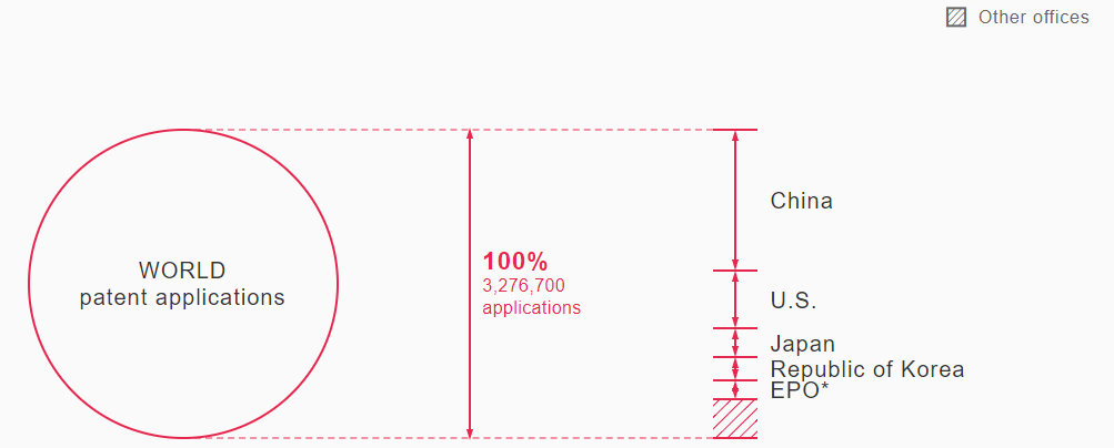 2020年,85%以上的专利申请发生在中国、美国、日本、韩国和欧洲专利局的知识产权局。中国占世界总量的45.7%。