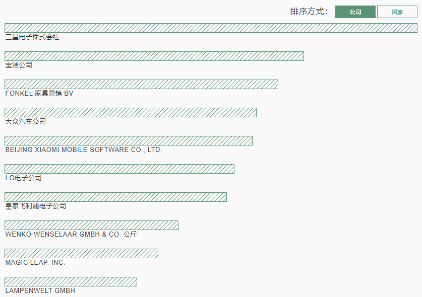 韩国三星电子在2020年用户榜上位居榜首,其次是美国宝洁和荷兰Fonkel Meubelmarketing BV。