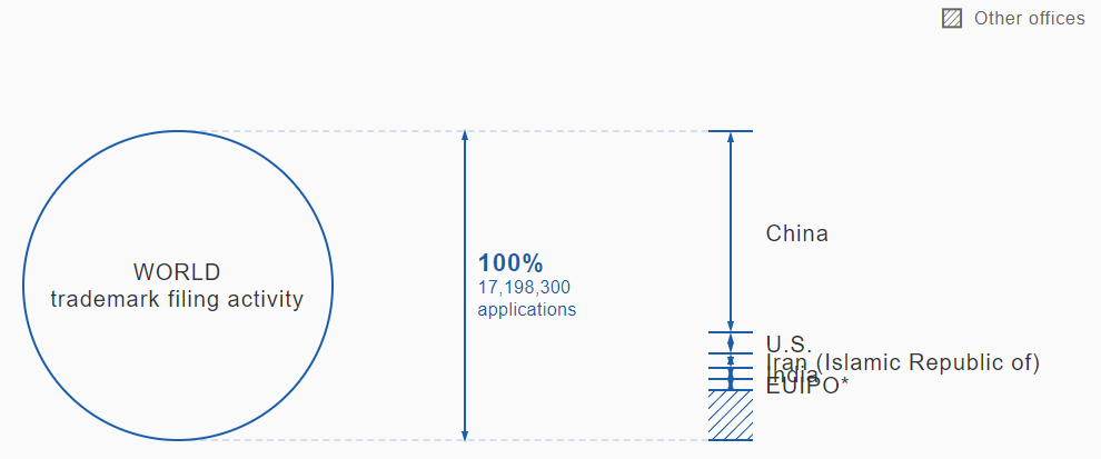 2020年,超过67%的商标申请活动(以类别数衡量)发生在中国、美国、伊朗伊斯兰共和国、欧盟知识产权局和印度的知识产权局。仅中国就占全球商标申请活动的54%以上,主要来自中国居民。