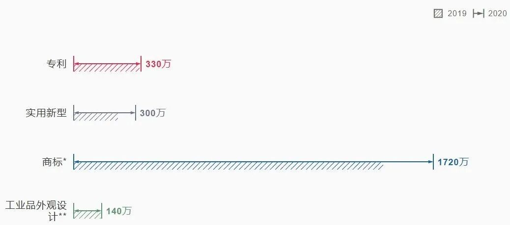 注: * 指类别数——商标申请中指定的商品和服务类别的总数。** 指设计计数——工业品外观设计申请中包含的设计总数。