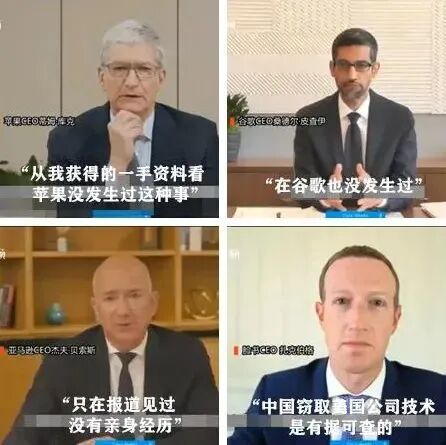 7月29日,谷歌、脸书、苹果、亚马逊四大巨头的一把手,以视频方式远程“出席”国会众议院反垄断委员会组织的听证会。