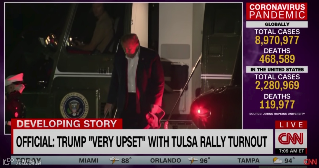 6月20日,特朗普在奥克拉荷马州一所可容纳近两万人的体育馆内,对着稀稀拉拉的观众,站着如喽啰。