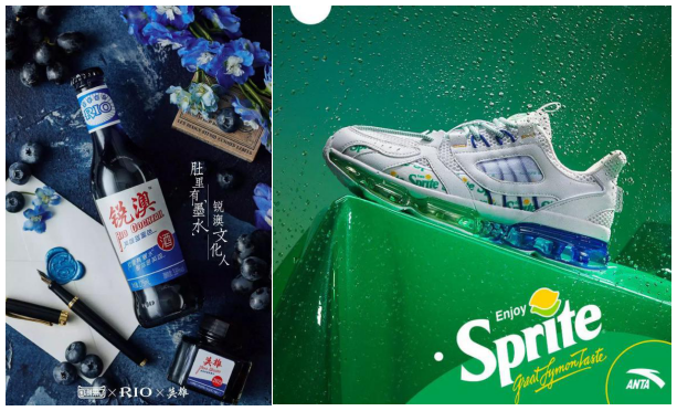 去年RIO与英雄墨水联名推出了RIO英雄鸡尾酒,该款鸡尾酒在包装上与英雄墨水包装类似,同时原料上采用了“蓝莓+黑加仑”,饮料颜色也接近英雄墨水的蓝墨色。巧借英雄墨水的书生气让RIO成了肚子里有“墨水”的文化人。英雄墨水的文化特征被巧妙转移到RIO鸡尾酒这一主体之上。