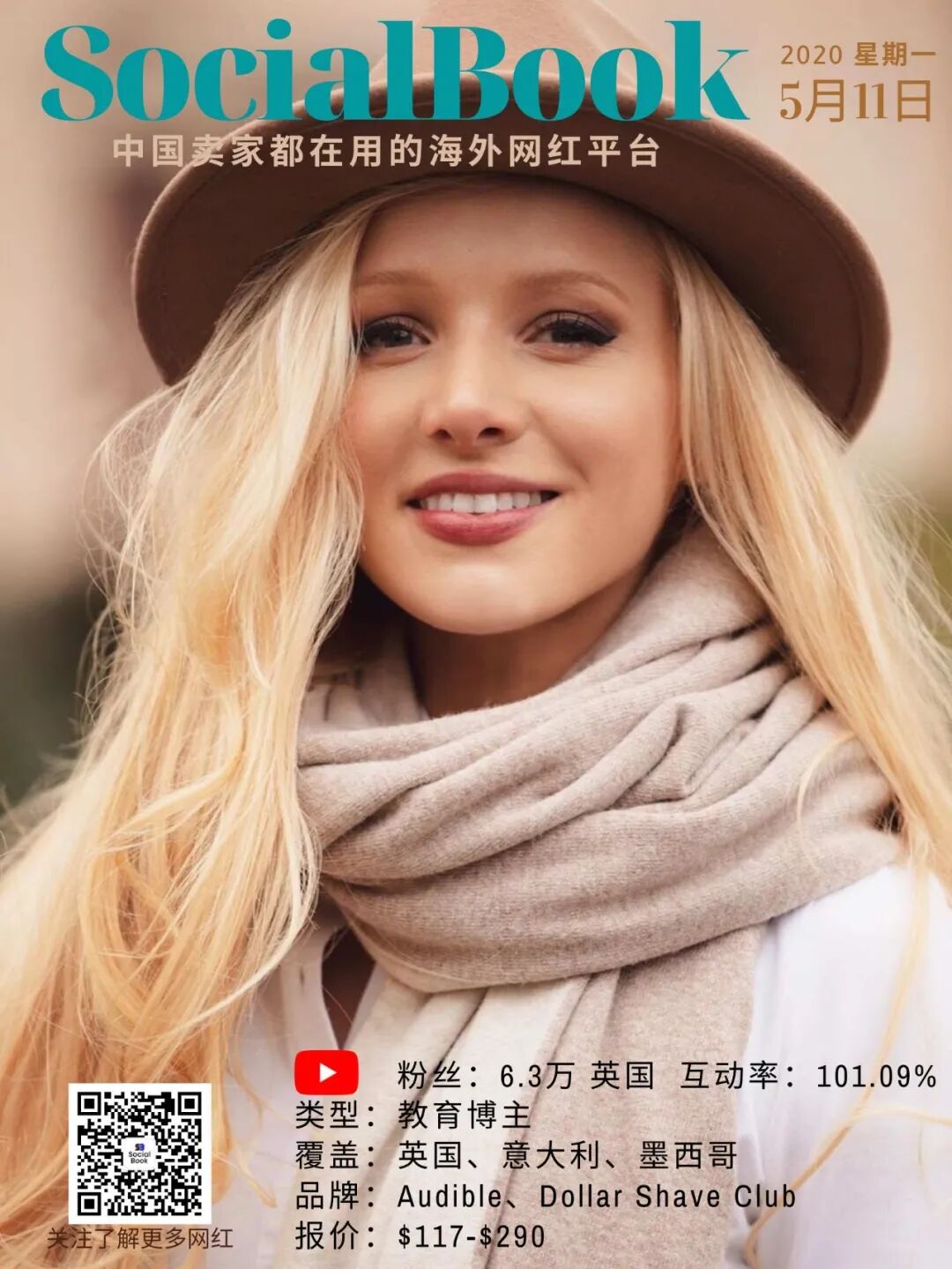 有这么美腻的博主来教大家学英语,是不是拥有了无限学习的动力?标准的英式发音,极具亲和力的甜美笑容,立刻捕获了小编的心。粉丝数量不多,但是互动率却惊人的高。话说这么高的颜值,当一个时尚博主也是轻而易举的吧!其实SocialBook不仅是帮助中国企业和卖家出海的网红营销平台,更可以帮助更多想在海外社媒做网红的博主们打造自己的IP哦!快来SocialBook开启你的全球网红梦想之路吧!