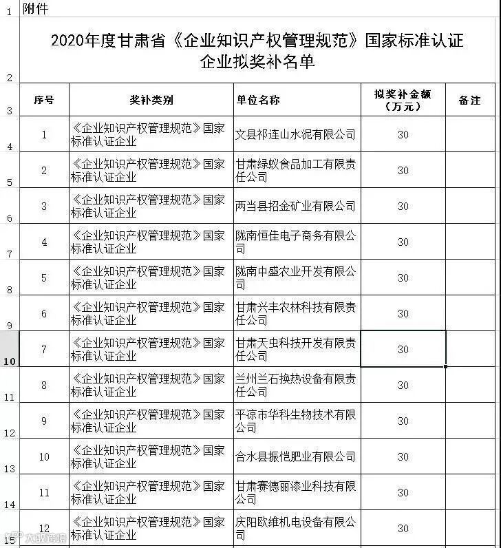 近日,记者从甘肃省市场监管局了解到,为落实《甘肃省支持科技创新若干措施》,根据国家认监委、国家知识产权局联合发布的《知识产权认证管理办法》的公告(2018 年第 5 号)有关规定,甘肃省市场监督管理局对所有申报企业进行了复核,2020 年度通过《企业知识产权管理规范》国家标准认证,且符合奖补条件的企业公示结束后,将按有关程序拨付补助资金。据悉,此次拟奖补企业有 29 家,拟奖补金额为 870 万元。(兰州日报)