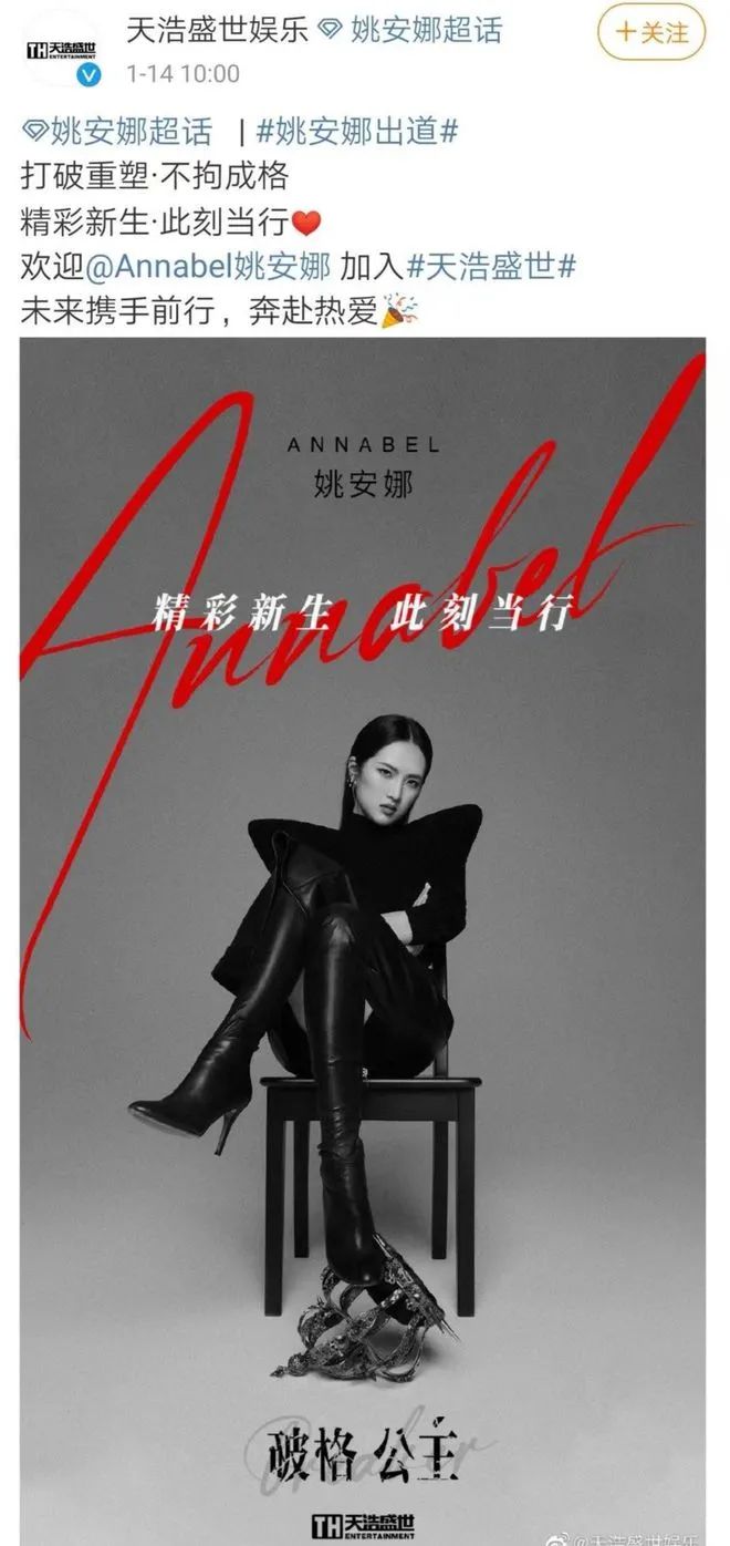 1月14日,天浩盛世娱乐官方微博发文宣布,姚安娜加入天浩盛世。就此,姚安娜正式出道。