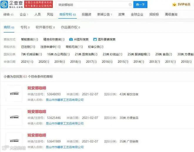值得一提的是,姚安娜相关商标曾屡次被抢注,企查查APP显示,截至目前2021年,“姚安娜”商标申请数量达76件。2月7日,昆山市饰馨家工艺品有限公司申请注册多个“姚安娜咖啡”商标,国际分类涉广告销售、餐饮住宿、方便食品等,该公司与华为无商业关联。