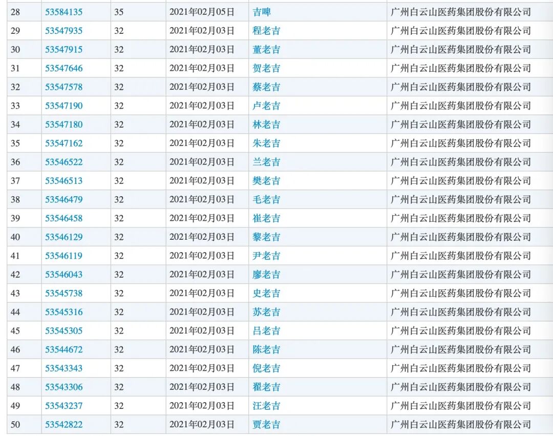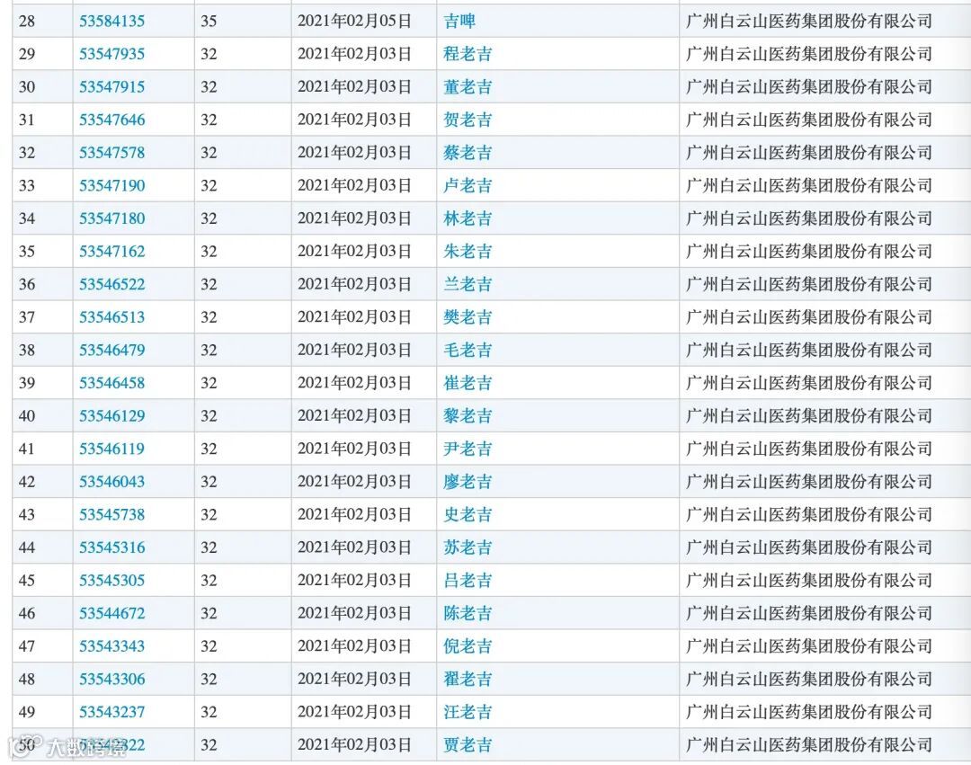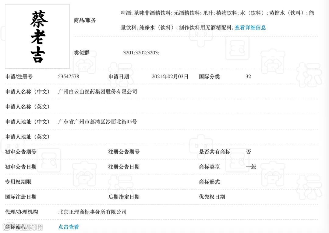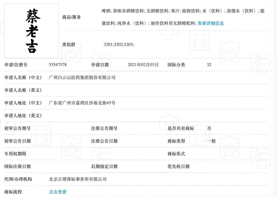 “萧老吉、程老吉、赵老吉、孙老吉……”中国商标网公开信息显示,这些商标均是在2021年2月3日一天之内申请的,共计100个。且这些商标申请的均非30类凉茶商品,而是在32类啤酒、茶味非酒精饮料、果汁等商品中。